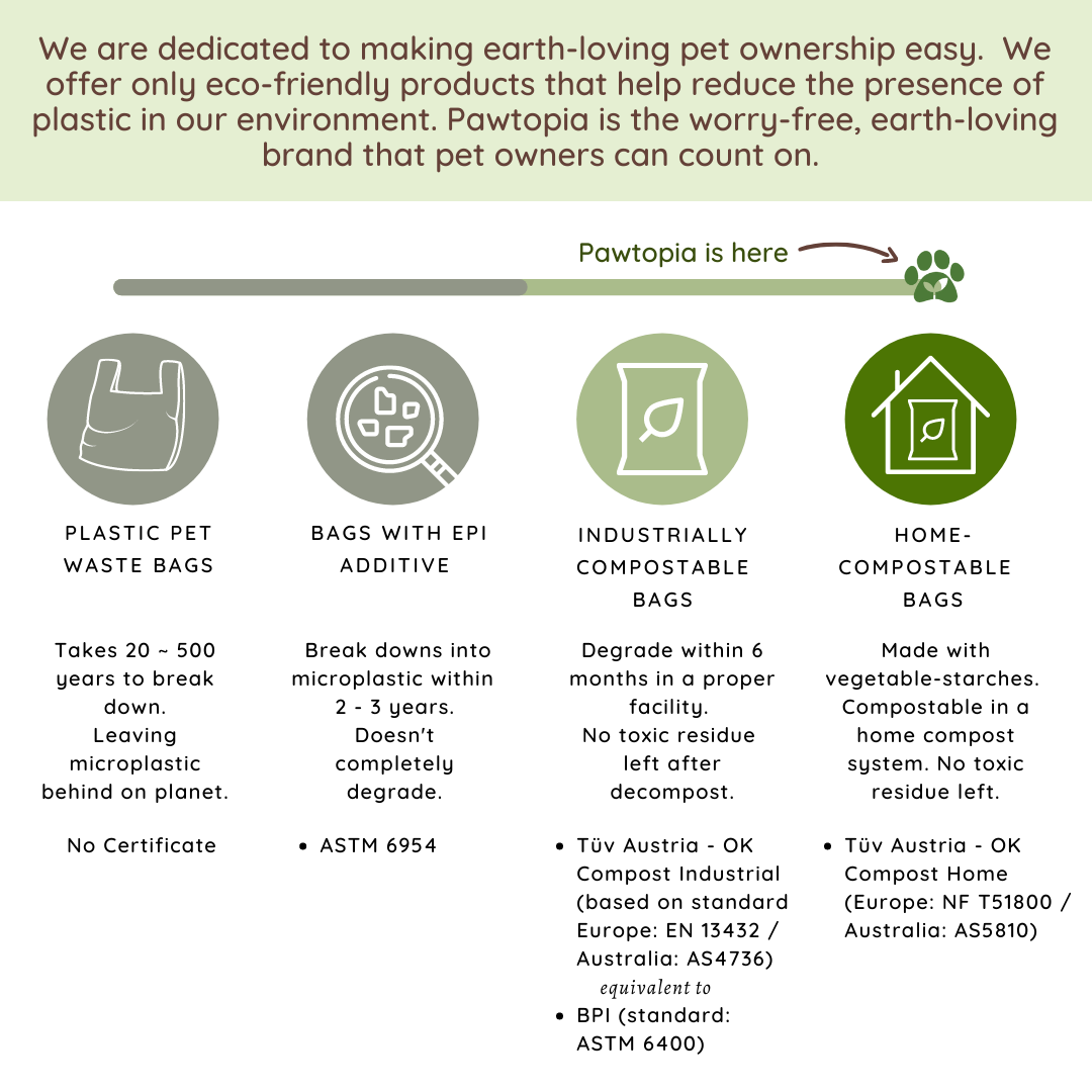 Purely environment-friendly dog poop bags (240 bags | 16 rolls): Pawtria supports sustainable living and does not harm the environment. The pet waste bags, made with vegetable starches, are 100% home compostable and break down into natural substances such as water, Co2, and biomass. Our bags are certified with OK Compost Industrial under EN 13432 (equivalent to ASTM6400), and OK Compost Home by Tüv Austria under AS5810/ NF T51800.